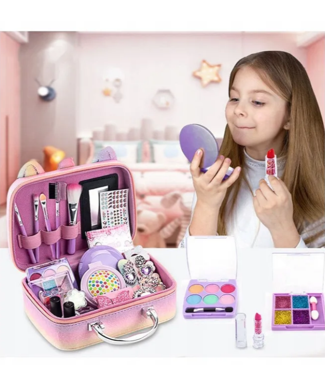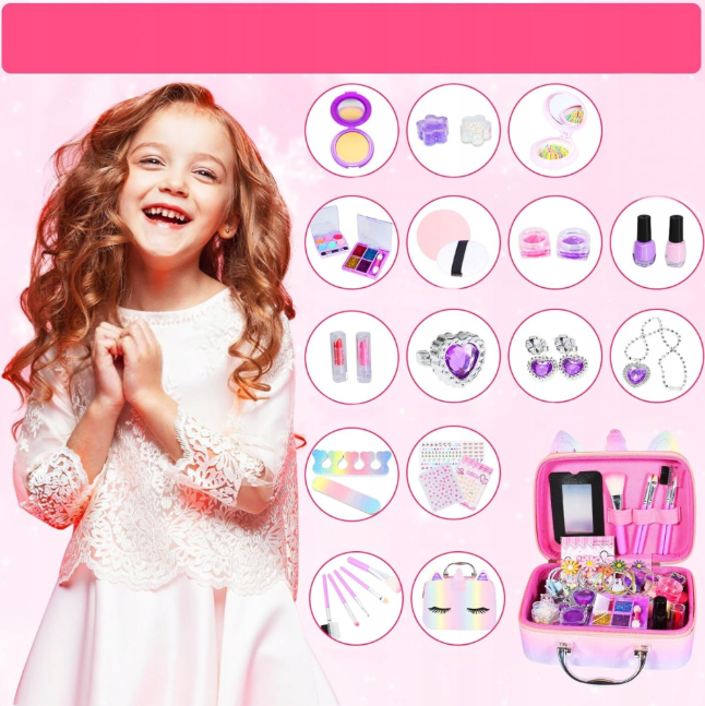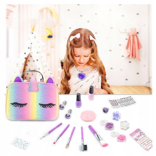 Уся косметика виготовлена з гіпоалергенних, безпечних для дитячої шкіри компонентів, легко змивається водою та не викликає подразнень. Яскраве оформлення у стилі єдинорога робить набір чудовим подарунком для дитини на день народження чи будь-яке свято.